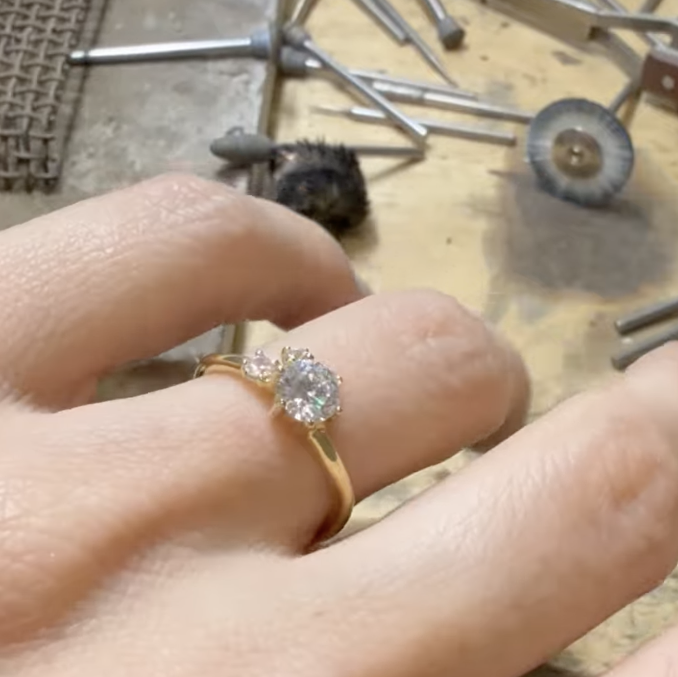 Prsten vyrobený ze 14k zlata s ručně vsazenými přírodními diamanty.